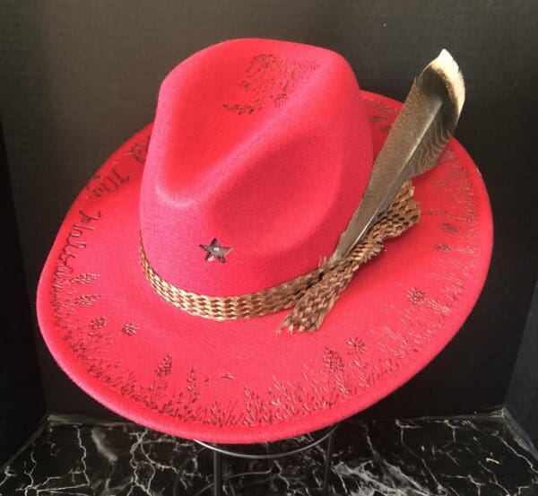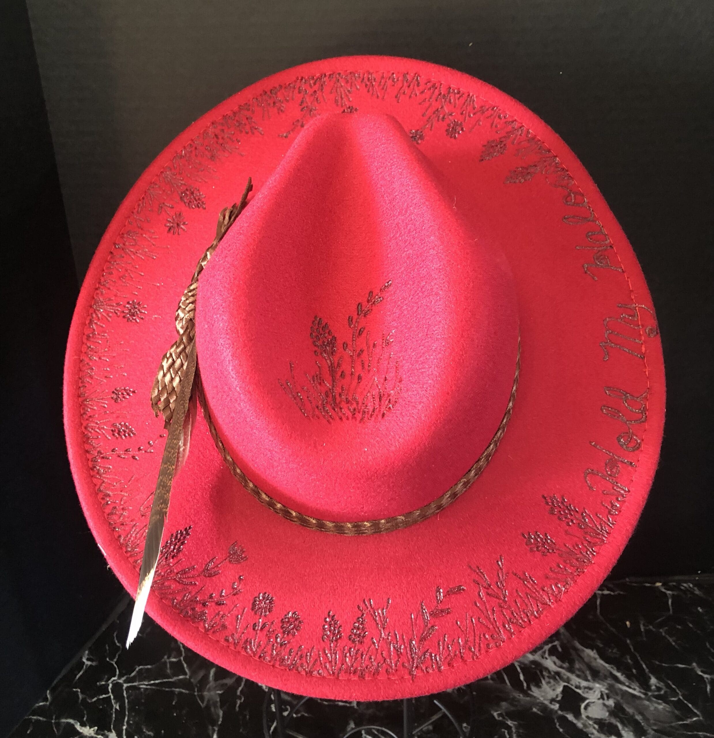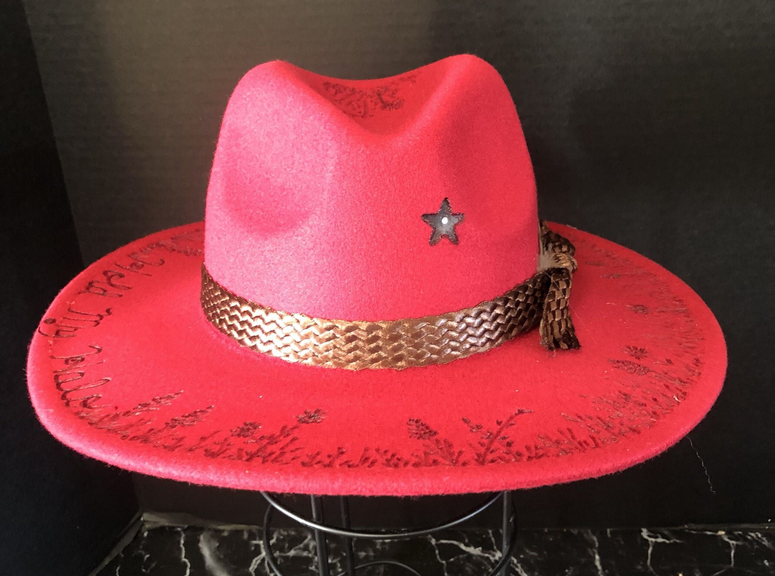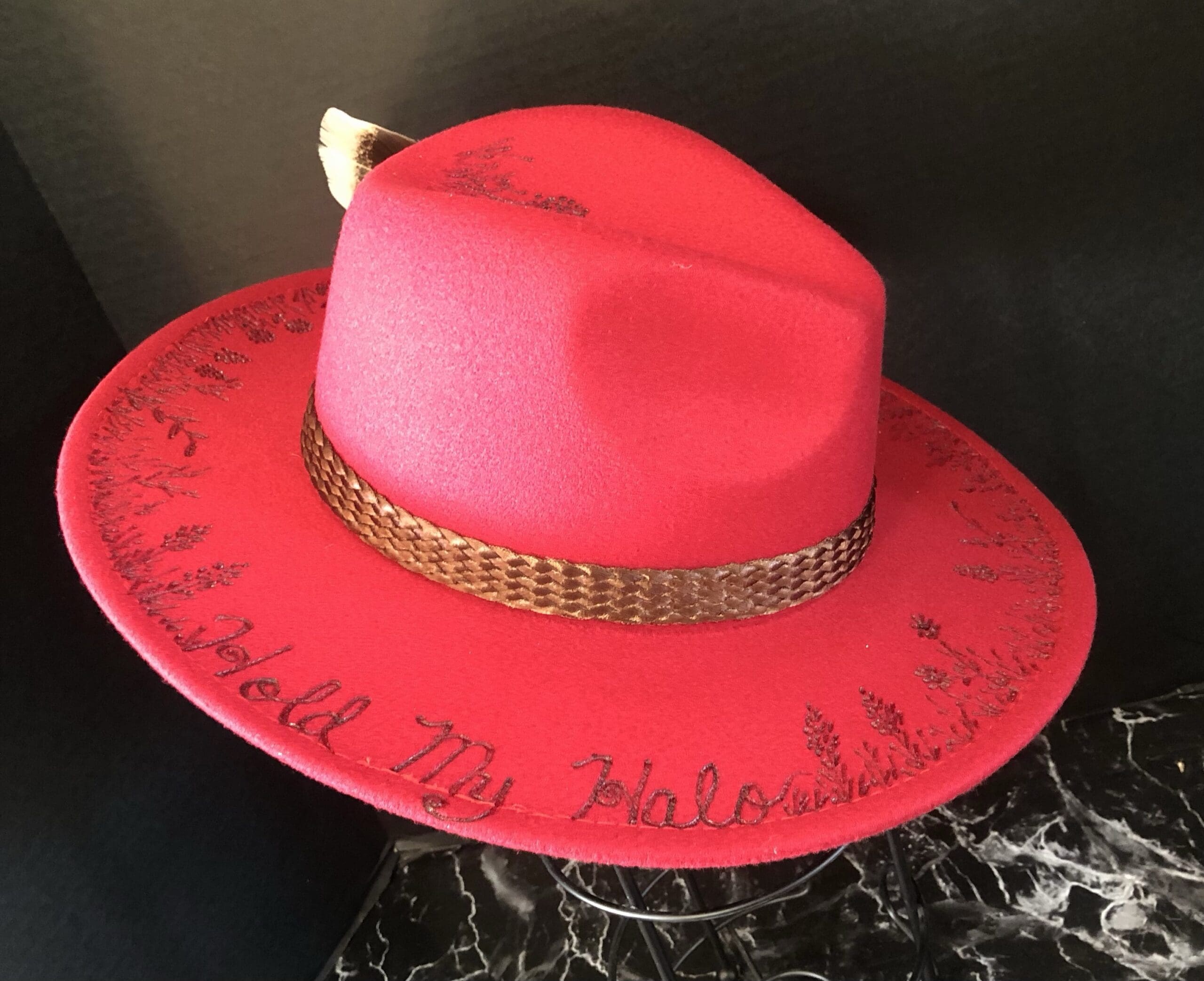 The Abilene is a smaller brim deep red felt with a hint to live by “Hold My Halo” and surrounded by wildflowers burnt around the brim.