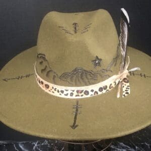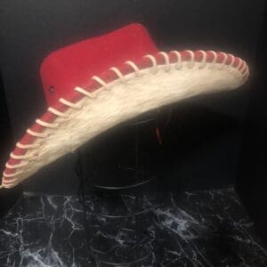 The hatband is braided leather finished off with a bronze concho tied with leather lacing.
