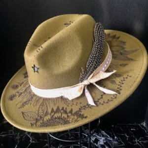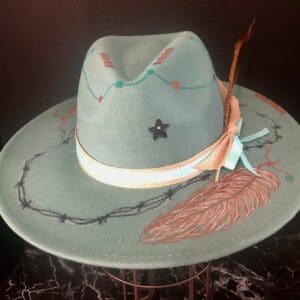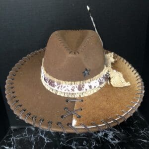 The hatband is braided leather finished off with a bronze concho tied with leather lacing.